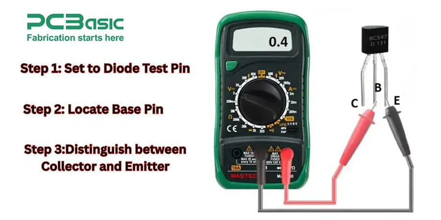 Step 3: Distinguish between collector and emitter. After finding the base pin, you'll need more testing to identify the collector and emitter: