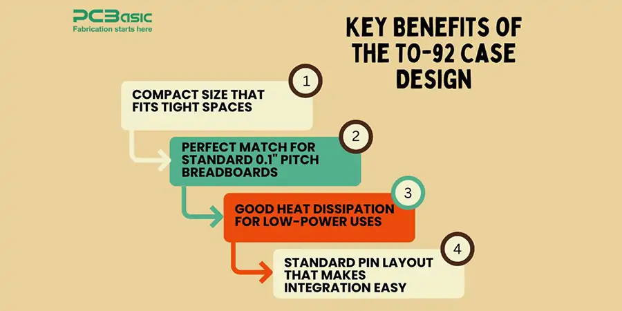 The TO-92 package width is between 4.32 and 5.33mm, its depth is between 4.45 and 5.20mm deep. It has three pins in a straight line at the bottom. Due to these characteristics, we can be use it in different circuit designs as per requirement.