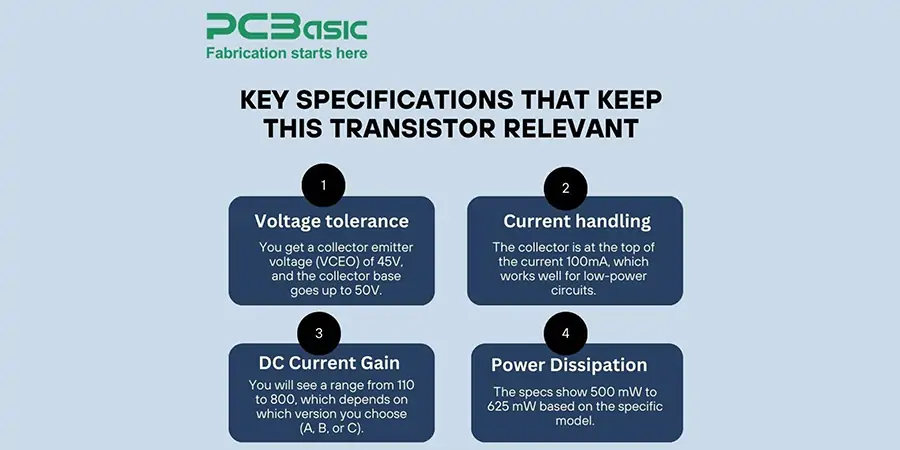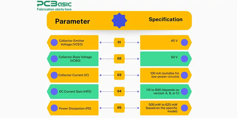 BC547 Transistor Key specifications play an important role in calculating circuit parameters and finding the right applications. Circuit designers can guess how it will behave under different circumstances by looking at its electrical properties.