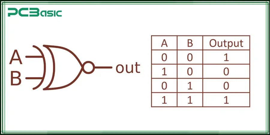 XNOR, or Exclusive NOR, is a composite logic gate combining the logic of XOR and NOT. It returns true (1) if both inputs are the same, otherwise displays false (0).