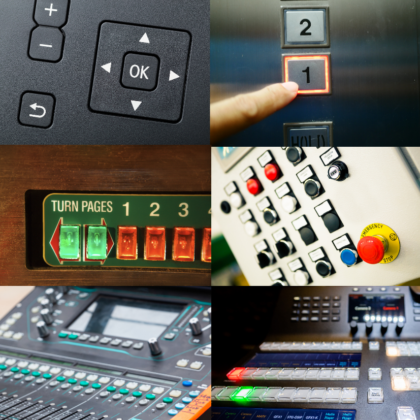 Buttons may be round, square, rectangular, or custom-shaped. Ergonomics need to be considered.