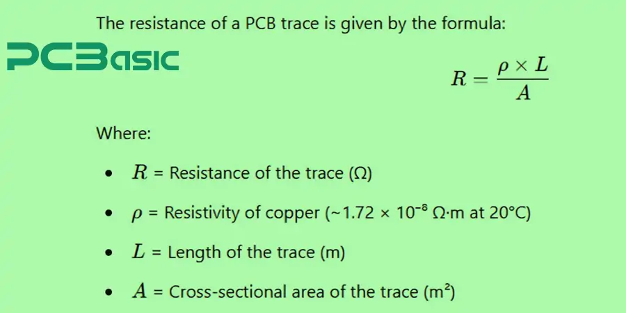 The following formula finds the resistance of a PCB trace: